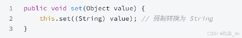 ② StringBox中的重写方法是set(String) 和 get(): String,与父类擦除后的set(Object) 和 get(): Object方法签名不匹配。