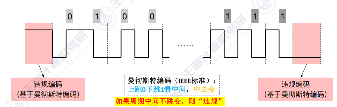 原理:使用违规信号表示帧的开头和结尾(这种方法需要物理层配合)。例如,使用曼彻斯特编码时将数据比特“1”编码成“高-低”电平对,将数据比特“0”编码成“低-高”电平对,而“高-高”电平对和“低-低”电平对在数据比特中是违规的,可以借用这些违规编码序列来定界帧的起始和终止。