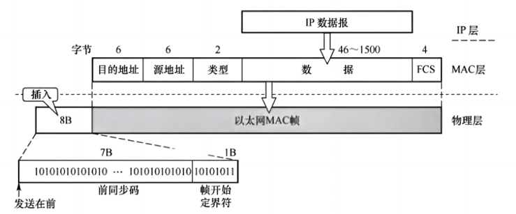 数据:46~1500字节,承载上层的协议数据单元(如IP数据报)。以太网的最大传输单元是 1500字节,若IP数据报超过1500字节,则必须将该IP数据报分片。此外,由于CSMA/CD算 法的限制,以太网帧必须满足最小长度是64字节,当数据字段的长度小于46 字节时,MAC 子层就在数据字段的后面加一个整数字节的填充字段,以确保帧长不小于64字节。