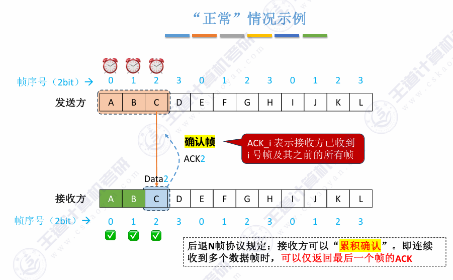 后退N帧协议:发送窗口 WT>1,接收窗口WR=1。