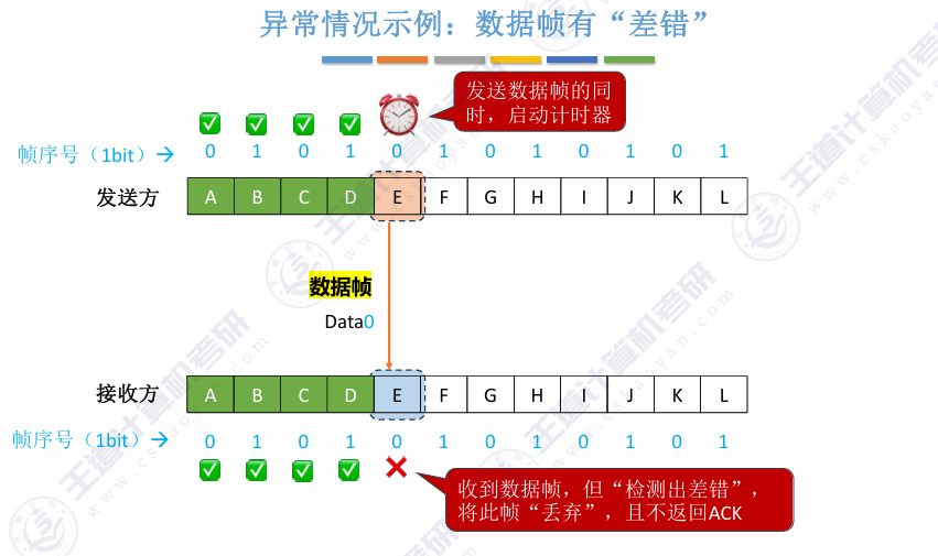 (a)到达接收方的数据帧可能已遭破坏,接收方利用前面介绍的差错检测技术检出后,简单地将该帧丢弃。为了应付这种可能的情况,发送方装备了计时器。在一个帧发送后,发送方等待确认,当计时器超时的时候,若仍未收到确认,则重发该数据帧。如此重复,直到该数据帧正确到达为止。如下图所示: