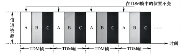 时分复用(Time Division Multiplexing,TDM)是指将信道的传输时间划分为一段段等长的 时间片,称为TDM帧,每个用户在每个TDM帧中占用固定序号的时隙,每个用户所占用的时隙 周期性地出现(其周期就是 TDM的长度),所有用户在不同的时间占用同样的信道资源。TDM 帧实际上是一段固定长度的时间,它与数据链路层的帧不是同一个概念。如下图所示。
