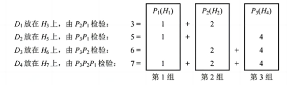 每个数据位用多个检验位进行检验,但要满足条件:被检验数据位的海明码位号等于检验该数据位的各检验位海明码位号之和。另外,检验位不需要再被检验。分组形成的检验关系如下: