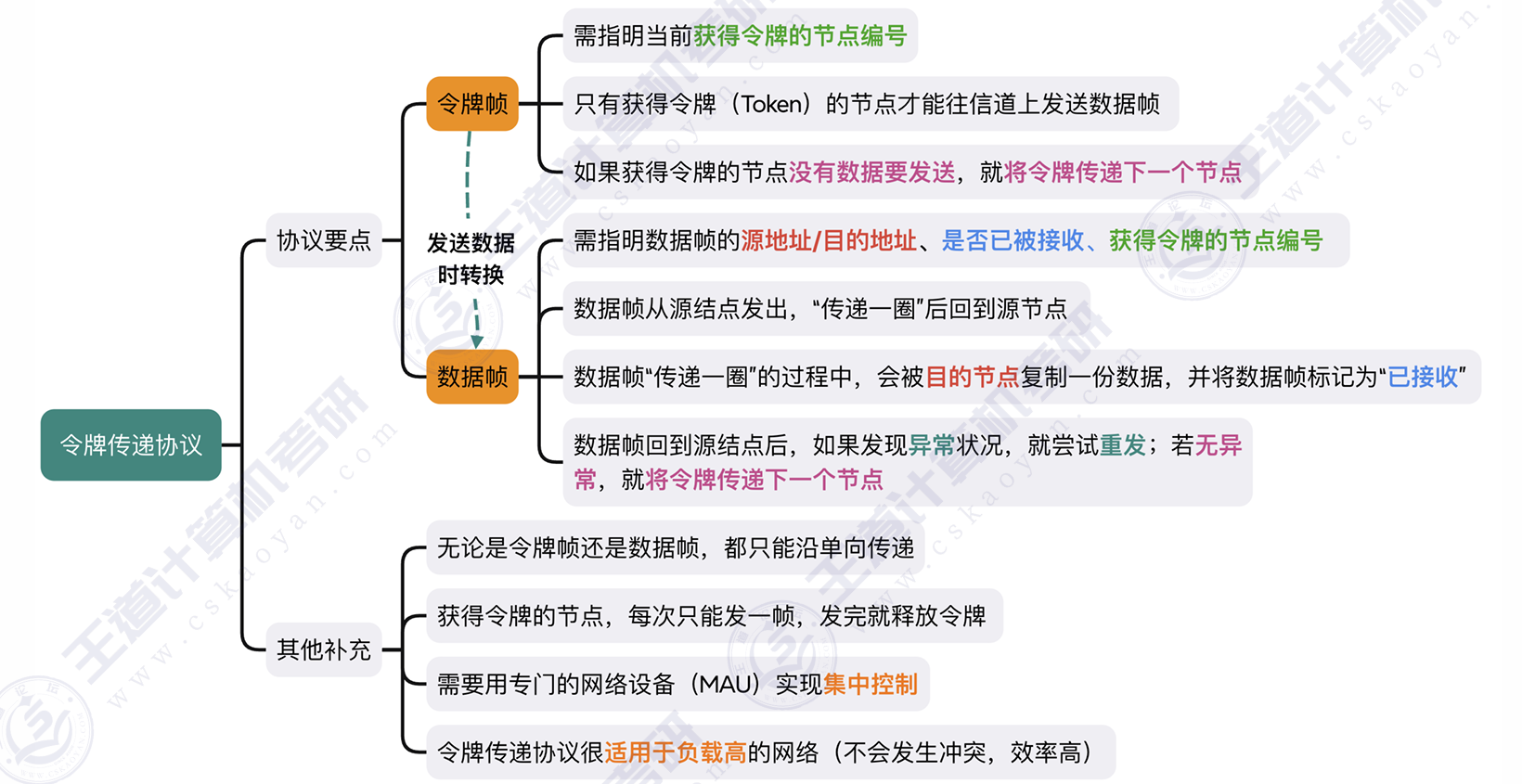 在令牌传递协议中,一个令牌(Token)沿着环形总线在各站之间依次传递。令牌是一个特 殊的控制帧,它本身并不包含信息,仅控制信道的使用,确保同一时刻只有一个站独占信道。当 环上的一个站希望发送帧时,必须等待令牌。站点只有取得令牌后才能发送帧,因此令牌环网络 不会发生冲突(因为令牌只有一个)。站点发送完一帧后,应释放令牌,以便让其他站使用。因 为令牌在网环上是按顺序依次传递的,所以对所有入网计算机而言,访问权是公平的。