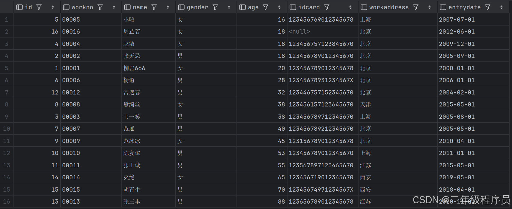 select id ,workno,name,gender,age,idcard,workaddress,entrydate from emp;
