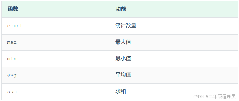 聚合函数即将一列数据作为一个整体,进行纵向计算 。select 的作用就是选择要展现的列,其后面可以接字段与聚合函数。