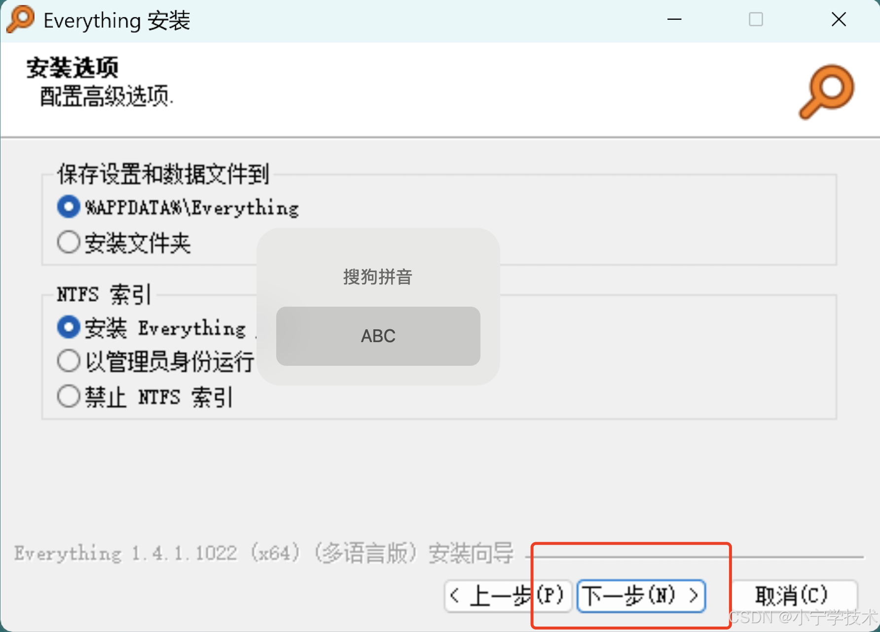在 “安装选项” 界面,可选择保存设置和数据文件的位置,以及 NTFS 索引相关设置。一般默认选项即可,确认后点击 “下一步” 。