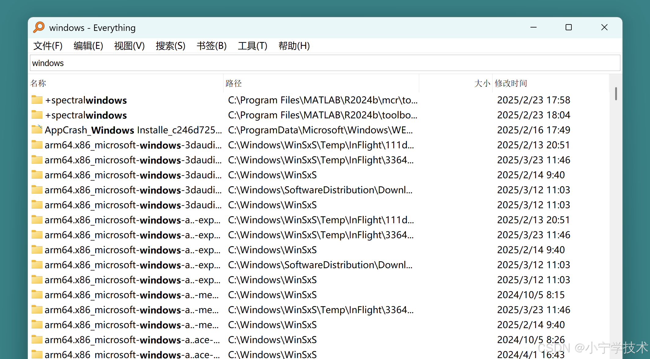 在软件搜索框中输入文件名关键词,如 “windows”,软件会实时显示文件名包含 “windows” 的所有文件和文件夹,显示名称、路径、大小和修改时间等信息。