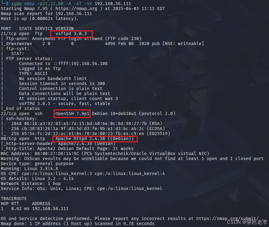 $ sudo nmap -p21,22,80 -A -sT -sV 192.168.56.111
