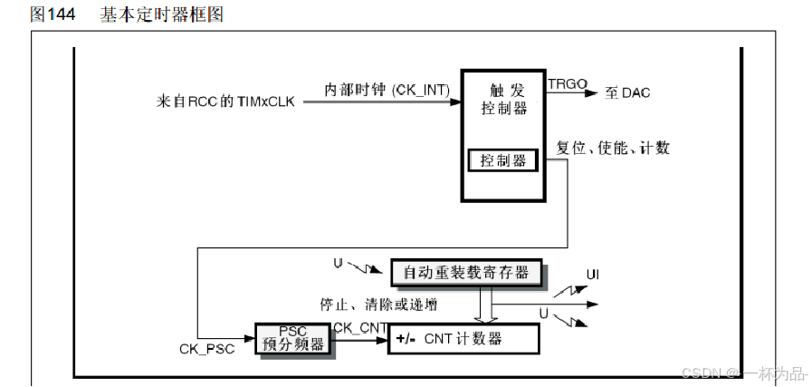 基本定时器只能以内部时钟为时钟源,其信号来源于RCC的TIMxCLK,频率值一般为系统主频72MHz。