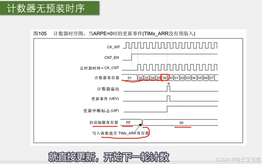 在这里我突然更改了自动加载寄存器,就是自动重装寄存器,由FF改成36,那计数值的目标值就由FF变成了36,所以这里计到36之后,就直接更新,开始下一轮计数。