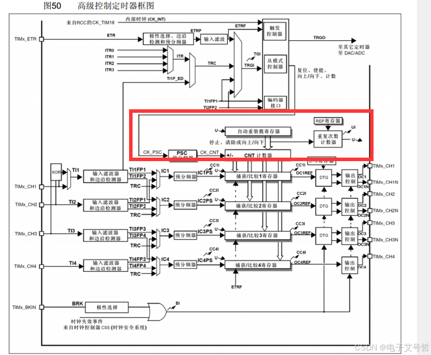 首先下面一部分,有三个最重要的寄存器:预分频器、计数器和自动重装寄存器,它们构成了最基本的计数计时电路,所以这一块电路就叫做时基单元。