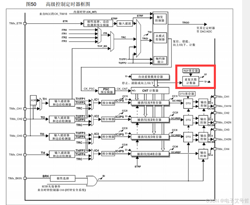 第一个是这里,申请中断的地方,增加了一个重复次数计数器,有了这个计数器,就可以实现每隔几个计数周期,才发生一次更新事件和更新中断,原来的结构是,每个计数周期完成后就都会发生更新,现在是有个计数器在这里,可以实现每隔几个计数周期更新一次,这就相当于对输出的更新信号又做了一次分频,那对于高级定时器的话,我们之前计算的最大定时时间59秒多,在这里就还需要再乘一个65536,这就又提升了很多的定时时间了;