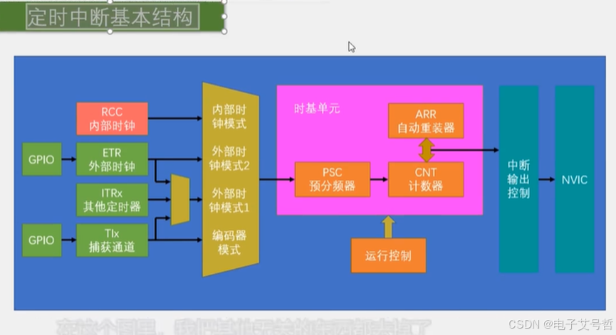 首先中间最重要的是预分频器(PSC)、计数器(CNT)、自动重装器(ARR)这三个寄存器构成的时基单元,下面是运行控制,就是控制寄存器的一些位,比如启动停止,向上或向下计数等等;