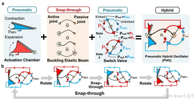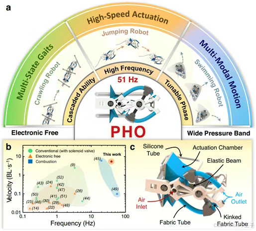 图2. 面向机器人多模式驱动的去电子化高频气动振荡驱动器(PHO)去电子化气动振荡驱动单元通常利用弹性结构的机械不稳定性,将恒定压力气动输入转化为周期性运动输出,以驱动机器人执行特定任务。然而,现有设计形式普遍依赖环路振荡结构,不仅振荡频率低,同时振荡模式也较为单一,极大限制了此类去电子化机械元器件的应用。针对上述问题,本研究引入刚弹软材料/结构相耦合的思想,将折展驱动腔体、屈曲双稳态梁和柔性换向阀有机融合,通过特殊的流道设计构建了机械负反馈机制,实现了在无需下拉电阻前提下的单驱动器独立振荡。该设计利用铰接双稳态梁失稳跳变过程中主被动轴的相位差构建流道切换窗口,大幅提升了频响带宽,实现了高达51Hz的最高振荡频率。该性能不仅大幅领先现有无电子化气动振荡驱动器,同时相比传统电磁阀也具有显著优势。