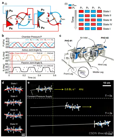 图5. 双足高频自振荡气动跳跃机器人针对常规振荡器依赖环路振荡的设计局限,本研究所提出的振荡单元提供了可任意驱动单元数量级联的能力。通过将多个振荡器的流道进行组合编辑,便可实现丰富的级联响应模式,从而用于具有多个逻辑驱动单元的机器人系统中。基于该设计,本研究提出了一种多足爬行机器人,该机器人由两个级联的振荡器构成,在恒定的输入气源下,两个驱动单元在给定周期内交替响应,从而实现稳定、快速的前向运动。