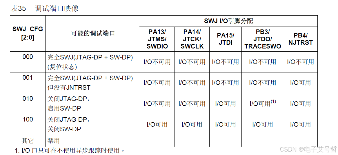 2、如果你想重映射定时器或者其他外设的复用引脚,那就加一下,第一句和第二句,先打开AFIO时钟,再用AFIO重映射外设复用的引脚,这样就行了,如果你重映射的引脚又正好是调试端口,那这三句都得加上:打开AFIO时钟,重映射引脚,解除调速端口,这样才行;
