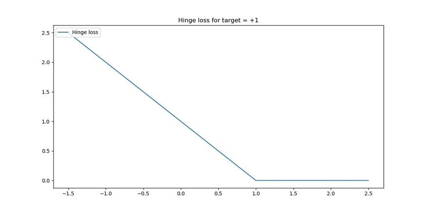 如果目标是 +1,则如下所示 — 对于所有目标 >= 1,损失为零(预测正确甚至过度正确),而当预测不正确时,损失会增加。