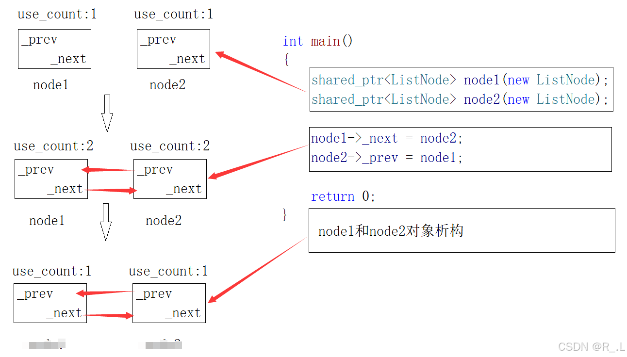 - node1和node2析构,引用计数减到1,但是_next还指向下一个节点。但是_prev还指向上一个节点。