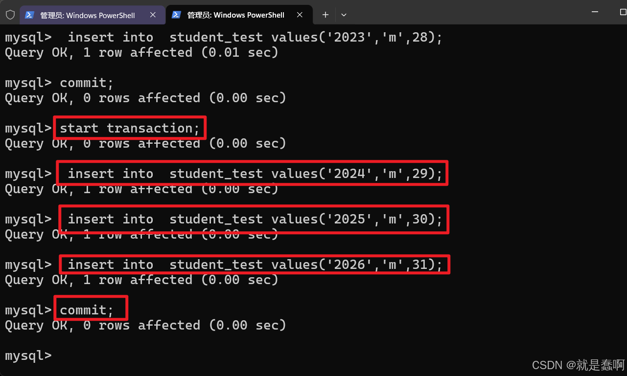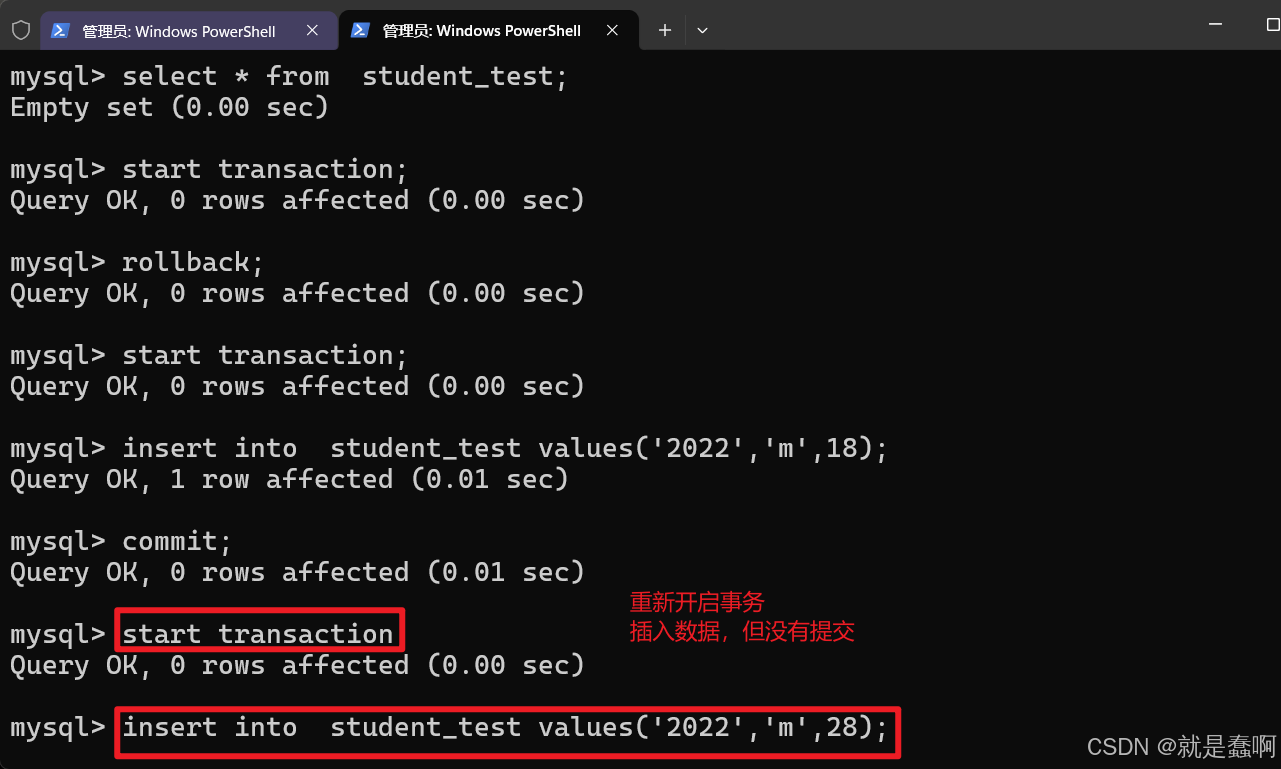 右侧窗口开启事务并插入数据,最后提交。