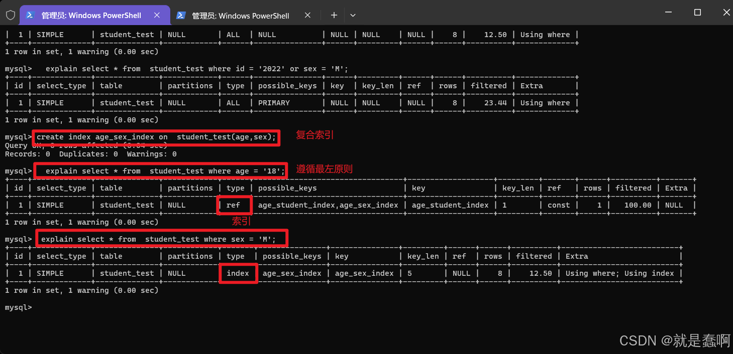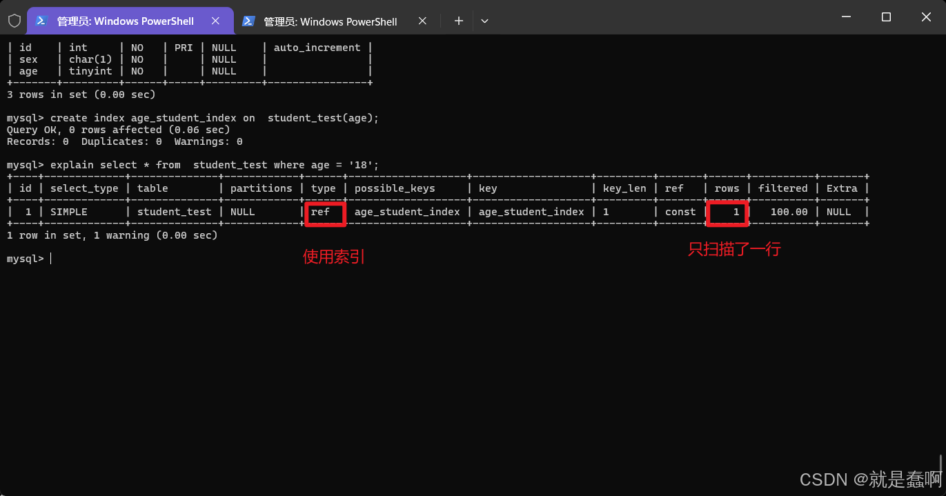 查询是否使用索引:explain select * from 表名 where 条件(与索引相关字段)