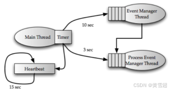 如图所示,Supervisor 启动三个线程。主线程读取 Storm 配置,初始化 Supervisor 的全局映射,在文件系统中创建持久化的本地状态,并调度周期性的定时器事件。有三种类型的事件,分别是: