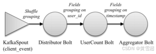 如图 8 所示,此拓扑结构有一个Spout。这个Spout是针对 “client_event” 信息流的 Kafka Spout。来自Spout的元组通过随机分组(shuffle grouped)发送到分发器(Distributor)Bolt,分发器Bolt根据名为 “user_id” 的属性 / 字段对数据进行分区。用户计数(UserCount)Bolt计算各种事件(如 “关注”“取消关注”“查看推文” 以及来自移动和网页客户端的其他事件)的唯一用户数量。这些计数每秒计算一次(即频率为 1 赫兹)。这些计数根据时间戳属性 / 字段进行分区,然后发送到下一个(聚合器,Aggregator)Bolt。聚合器Bolt聚合它接收到的所有计数。
