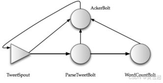 为了提供 “至少一次” 语义,拓扑结构会添加一个 “确认器(acker)” Bolt,它会为Spout发出的每个元组跟踪元组的有向无环图。例如,增强后的推文单词计数拓扑结构如图 6 所示。