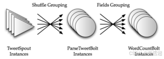 图 1 展示了一个简单的拓扑结构,它用于统计推文中出现的单词,并每 5 分钟生成一次这些单词的计数结果。此拓扑结构有一个Spout(TweetSpout)和两个Bolt(ParseTweetBolt 和 WordCountBolt)。TweetSpout 可能从 Twitter 的 Firehose API 提取元组,并持续将新推文注入拓扑结构。ParseTweetBolt 将推文拆分为单词,并为每个单词发出二元元组(单词,计数)。WordCountBolt 接收这些二元元组,汇总每个单词的计数,并每 5 分钟输出一次计数结果。在输出单词计数后,它会清空内部计数器。