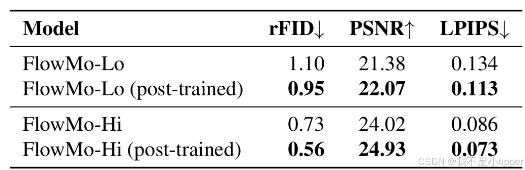 特别是,没有模式寻求后训练阶段,FlowMo-Lo 的 rFID 会从 0.95 下降到 1.10,FlowMo-Hi 的 rFID 会从 0.56 下降到 0.73。