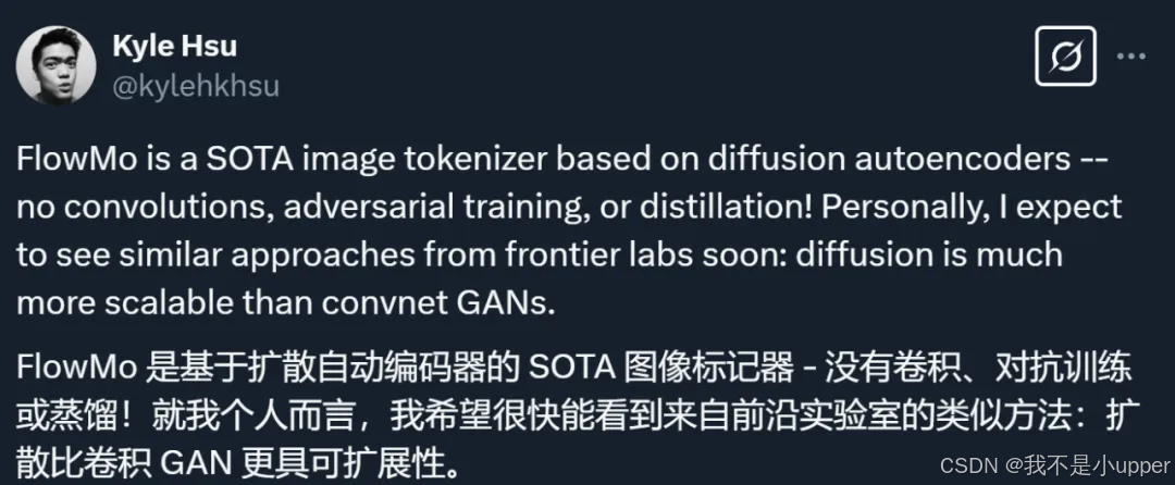 当我们悠然刷着手机,看到一张可爱猫咪的照片时,大脑会瞬间识别出「这是一只猫」,这一切不过是电光火石间的事儿。但在计算机的 “眼中”,情况却复杂得超乎想象。假设这是一张1000×1000像素的彩色照片,在计算机的世界里,它摇身一变,成了一个包含300万个数字的庞大数据集(1000×1000×3个颜色通道)。每一个数字都承担着重要使命,它们代表着对应像素点颜色的深浅程度,取值范围从0到255,0是深沉的黑色,255则是明亮的白色,而中间的数值就是各种过渡的灰色调。这些数字密密麻麻地排列在一起,就像一幅神秘的数字拼图,等待计算机去解读。 在人工智能领域,随着技术的飞速发展,图像数据如同潮水般涌来。AI模型要想高效地从成千上万张这样复杂的图像中学习,就必须找到一种巧妙的方法来处理这些庞大的数据。就好比一个人面对堆积如山的书籍,要想快速获取知识,就得有一套高效的阅读和整理方法。对AI模型而言,这个方法就是对图片进行压缩。在当前最先进的图像生成模型里,第一步操作至关重要,它有个专业的名字叫tokenization,执行这一操作的组件就叫做tokenizer,中文可译为 “分词器”,不过在图像领域,它的作用远超普通的分词概念。 tokenizer堪称图像领域的 “神奇压缩大师”,它的主要目标是将原始图像,也就是那一大串复杂的数字矩阵,压缩到一个更小、更易于处理的潜在空间中。想象一下,把一个庞大的图书馆压缩成一个小巧的移动硬盘,却又能保留其中的关键信息。经过tokenizer处理后,图像被转化成了一种更紧凑的表示形式,这些紧凑的 “token” 就像是经过提炼的知识精华,让后续的生成模型能够更高效地学习图像的特征和模式,进而更加快速、准确地生成新的图像。比如在生成逼真的风景图像时,生成模型可以依据tokenizer处理后的信息,快速勾勒出大致的山川、河流形状,再逐步细化色彩和纹理。因此,如何研发出性能更优、效果更好的tokenizer,成了图像生成、处理等相关领域研究者们心心念念、全力攻克的重要课题 。 最近,来自斯坦福大学的李飞飞、吴佳俊团队在这个难题上取得了新突破。他们在一篇新论文中,提出了一种名为「FlowMo」的创新改进方案,论文的第一作者是斯坦福大学计算机科学专业的博士生Kyle Sargent。这一方案就像一把新钥匙,为解决图像tokenizer的优化问题,打开了一扇充满可能的新大门 。