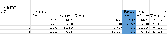 前四个主成分的特征值大于1(5.560、2.736、1.379、1.012),因此这四个主成分解释了数据的大部分方差,总计解释了82.208%的方差。
