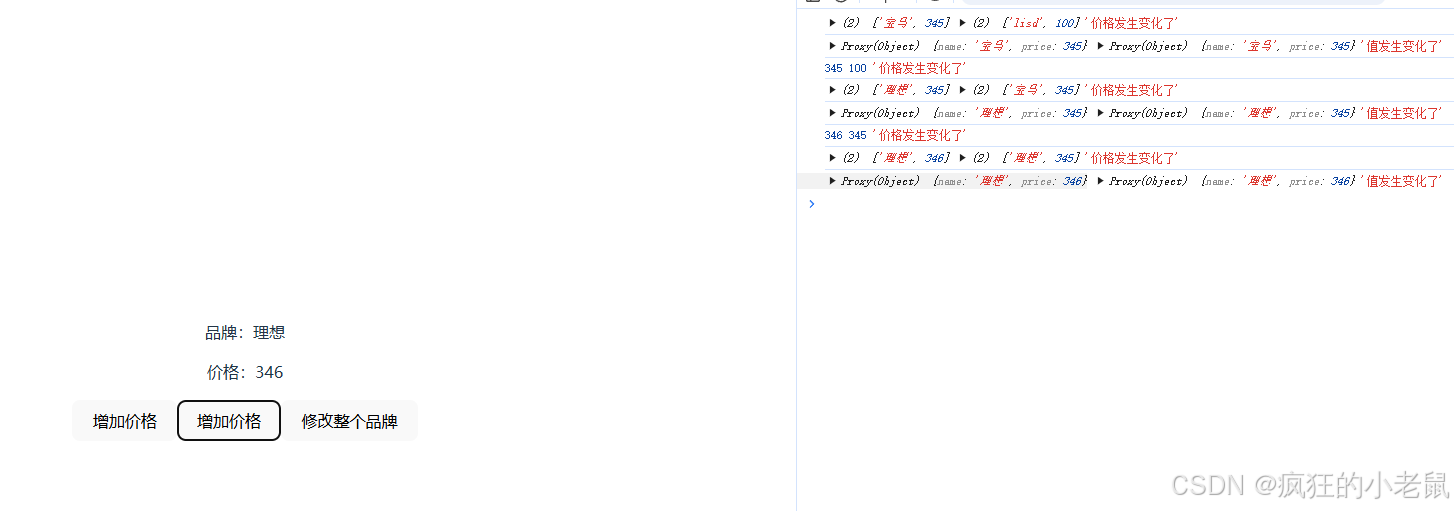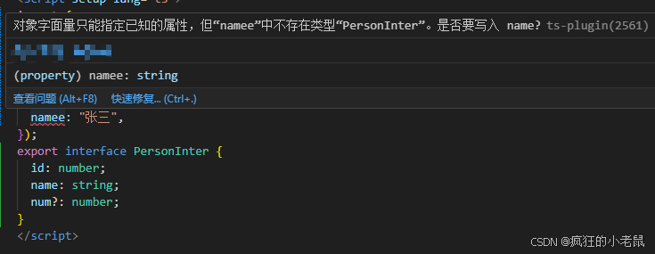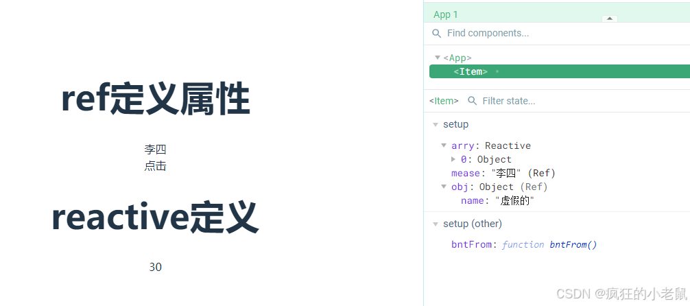 <template> <div> <h1>ref定义属性</h1> {{ mease }} <div @click="bntFrom"> 点击 </div> <h1>reactive定义</h1> <p v-for="item in arry" :key="item.name">{{ item.age }}</p> </div> </template> <script lang="ts" setup> import { ref, reactive } from 'vue' let mease = ref('张三') let obj = ref({name: "真实的"}) let arry = reactive([{ name: '王二', age: 10 }]) function bntFrom(){ mease.value = '李四' obj.value.name = '虚假的' arry[0].age = 30 console.log('点击了'); } </script>