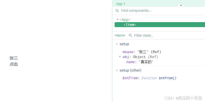 <template> <div> {{ mease }} <div @click="bntFrom"> 点击 </div> </div> </template> <script lang="ts" setup> import { ref } from 'vue' let mease = ref('张三') 引用类型 let obj = ref({name: "真实的"}) function bntFrom(){ mease.value = '李四' obj.value.name = '虚假的' console.log('点击了'); } </script>