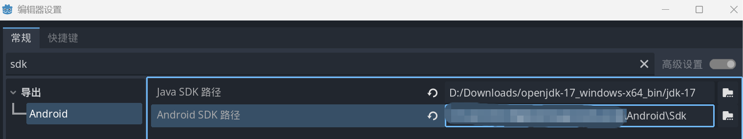 第五步,返回到 编辑器设置->导出->Android->Android SDK路径 中,将路径粘贴上去;