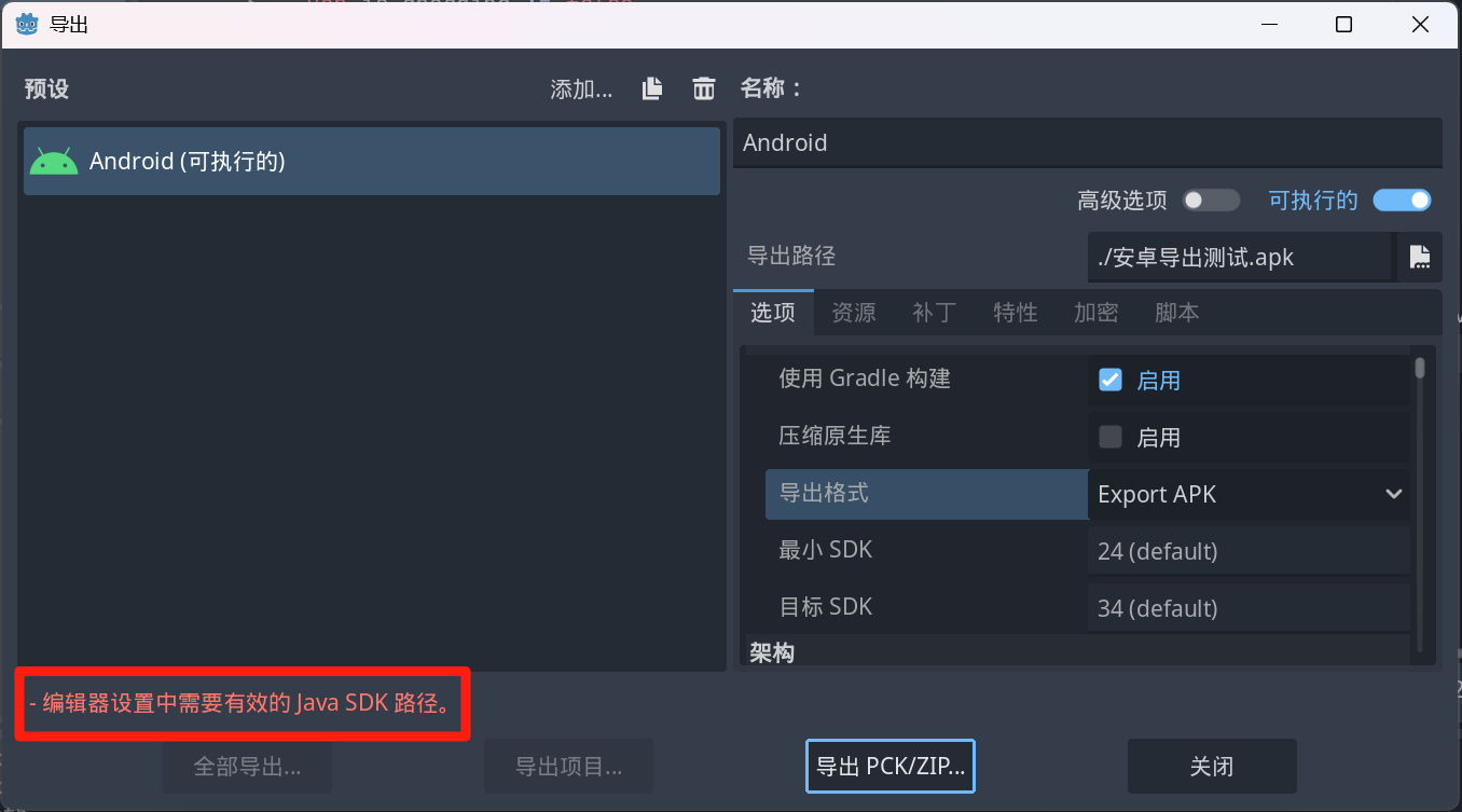 第一步,正常导出,与前文相比这里需要勾选 Gradle构建 ,然后发现报错了;