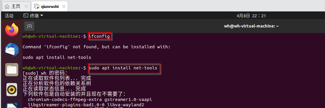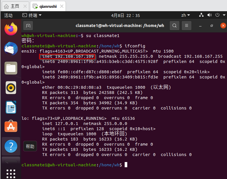(6)查看Ubuntu的网卡名称和虚拟机IP