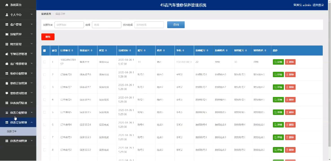 二十一世纪我们的社会进入了信息时代,信息管理系统的建立,大大提高了人们信息化水平。传统的管理方式已经与当今4S店汽车维修保养管理系统的业务需求不相适应,也与4S店汽车维修保养管理系统化建设的发展趋势不相适应。本文针对这一需求设计并实现了一个基于SSM的4S店汽车维修保养管理系统的设计与实现,为了简捷并有效的解决车辆各方面的问题。 本文讲述了4S店汽车维修保养管理系统的设计与实现。结合电子管理系统的特点,分析了车辆信息管理的现状,给出了4S店汽车维修保养管理系统实现的设计方案。 本论文主要完成不同用户的权限划分,不同用户具有不同权限的操作功能,在用户模块,主要有进行注册和登录,客户可以实现对系统首页、个人中心、车辆信息管理、客户维修管理、维修分配管理、维修订单管理、维修费用管理、保养预约管理、保养分配管理、保养订单管理、保养费用管理等;技师可以实现对系统首页、个人中心、维修分配管理、维修订单管理、保养分配管理、保养订单管理;财务可以实现对系统首页、个人中心、维修订单管理、维修费用管理、保养订单管理、保养费用管理;管理员可以对系统首页、个人中心、客户管理、技师管理、财务管理、车辆信息管理、客户维修管理、维修分配管理、维修订单管理、维修费用管理、保养预约管理、保养分配管理、保养订单管理、保养费用管理等进行相应的操作。 关键词:4S店汽车维修保养管理系统;SSM框架 ;MySQL数据库