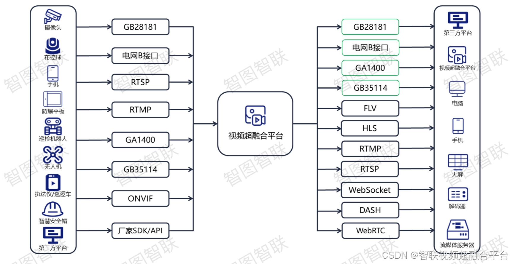 智联视频超融合平台通过GB/T28181-2011/2016/2022、国网B接口、RTSP、RTMP、ONVIF、GB/T35114、GA1400、海康大华SDK/API等方式,接入海康、大华、宇视等各个厂家的摄像机、录像机,接入直播手机,接入下级平台,提供web客户端进行视频预览、录像回放、配置管理和智慧运维。