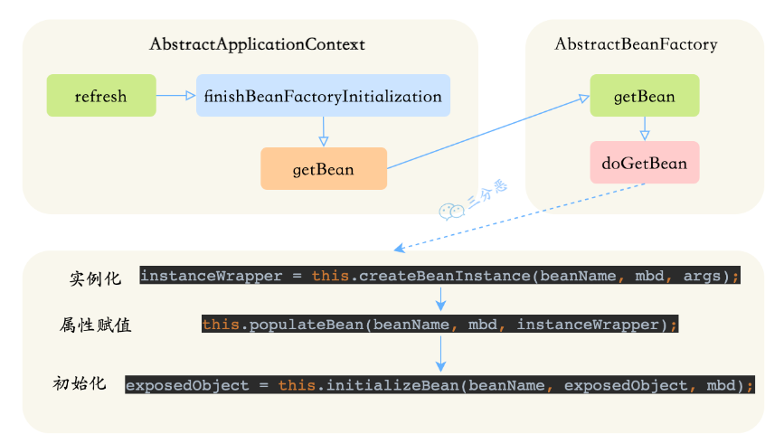 可以在源码 AbstractAutowireCapableBeanFactory 中的 doCreateBean 方法中,看到 Bean 的前三个生命周期: