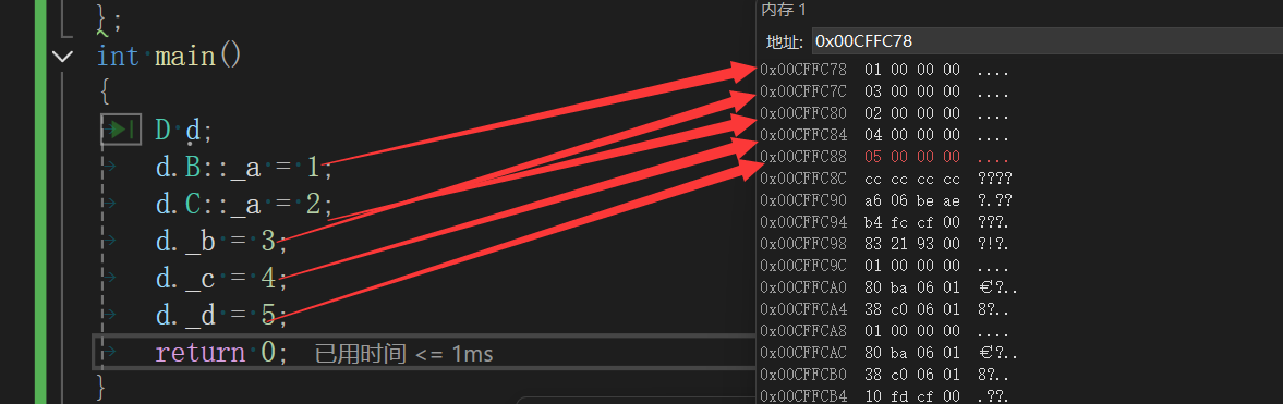 我们若是将D类对象赋值给B类对象,在这个切片过程中,就需要通过虚基表中的第二个数据找到公共虚基类A的成员,得到切片后该B类对象在内存中仍然保持这种分布情况。