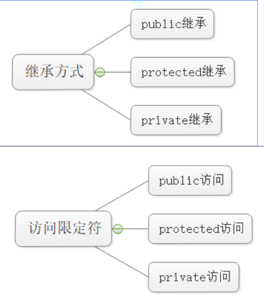 一共九种的访问方式,太多了,但是我们可以看到一个规律只要是基类中的成员是private,继承下来在子类中都是不可见的,而除了私有以外,我们发现都是可见的。基类的其他成员在子类中的访问方式==min(成员在基类的访问限定符,继承方式)public>protected>private