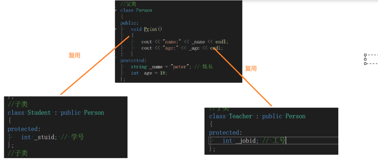 继承后父类的Person的成员(成员函数+成员变量)都会变成子类的一部分。这里体现出了