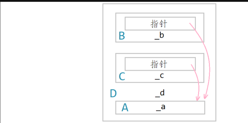 通过这俩个对比我们可以发现一个问题就是对象D中_a的好像带最后一个位置去了,然后本来虚拟继承之前B中_a,C中_a的位置怎么好像变成指针了。