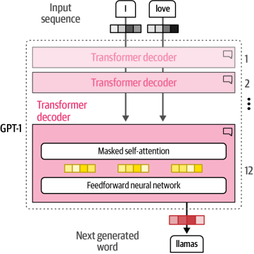 这些生成式仅解码器模型,尤其是“较大”的模型,通常被称为大型语言模型(LLMs)。正如我们将在本章后面讨论的那样,LLM这个术语不仅保留给生成式模型(解码器-only),还保留给表示模型(编码器-only)。