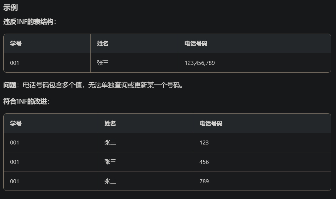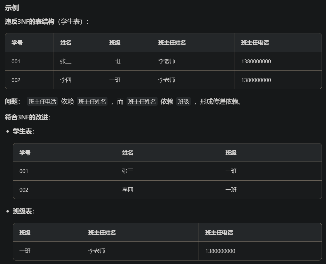 - 第三范式:在满足2NF的基础上,非主键字段不能间接依赖其他非主键字段(消除传递依赖)。