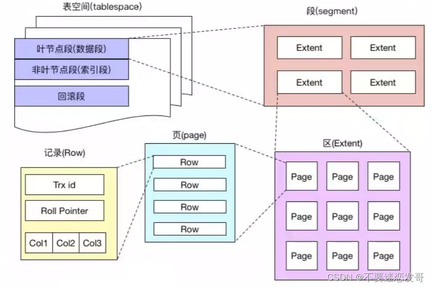 - 区(Extent):段由一个或多个区组成,区是一组连续的页,通常包含 64 个连续的页,也就是 1M 的数据。使用区而非单独的页进行数据分配可以优化磁盘操作,减少磁盘寻道时间,特别是在大量数据进行读写时。
