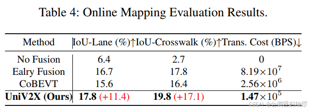 端到端自动驾驶最终规划结果,作者认为L2 Error指标似乎不太合理,因此一直讨论的是碰撞率,车道偏离率与传输成本。但我感觉这里的BPS对比好像设置的不是很合理,因为没有和一些专注于提升通信效率的算法相比,而只是证明了通过稀疏-密集混合传输使得传输的数据量减少了。