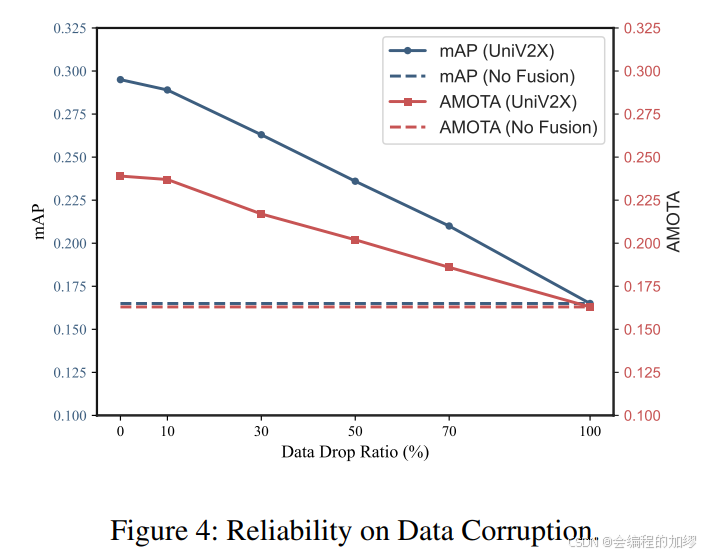 在评估 UniV2X 时,我们的第一步是在传输过程中随机丢弃 10%、30%、50%、70% 和 100% 的基础设施智能体查询,以此来模拟数据损坏的情况。(这一块感觉论文中也没有详细说明,UniAD中说的是模块化的端到端让该模型变得更加可解释…可能是基于此)